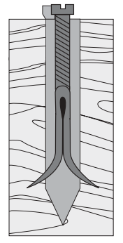 Составной гвоздь, включающий основную и распорную часть. Основа забивается типовым молотком, после чего в нее интегрируется распорка. Последняя расщепляет основу, увеличивая несущие показатели узла.
