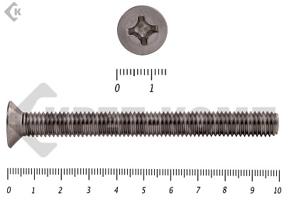 Винт DIN 965 из нержавейки с потайной головкой с крестообразным шлицем и полной резьбой. Данные винты выполнены из нержавеющей стали, благодаря чему, могут использоваться и в агрессивных средах, с повышенной влажностью. Винты нержавеющие DIN 965 используются в строительстве, машиностроении, промышленных и производственных отраслях совместно с шайбами, гайками соответствующих размеров.