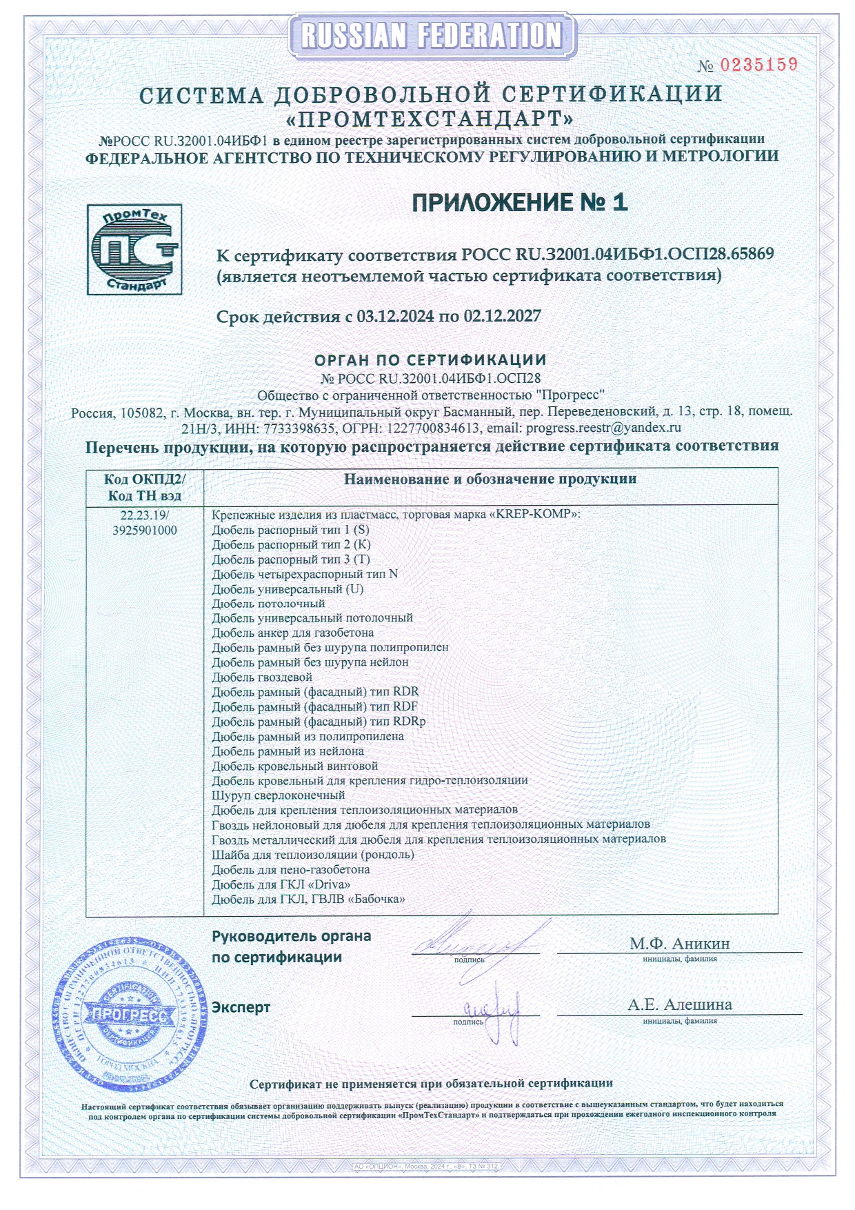 • Сертификат соответствия ФДКП с прессшайбой